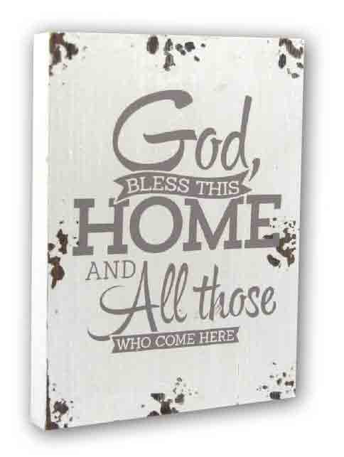 Cute wooden plaque with a prayer of blessing on it. “God bless this home and all those who come here.” White paint with a distressed look. Would make a lovely house warming gift. Has a metal hook for hanging.20cm x 14.5cm.